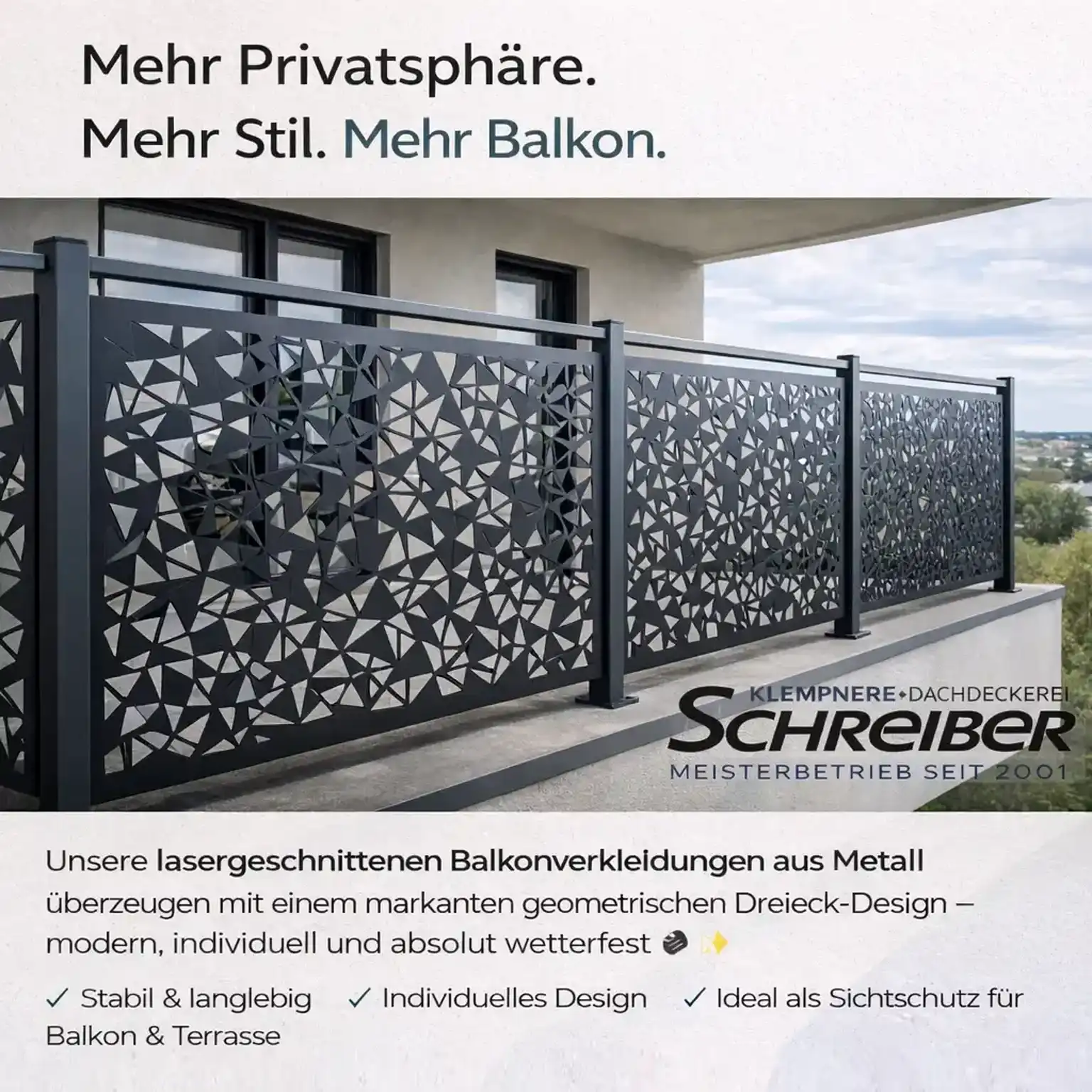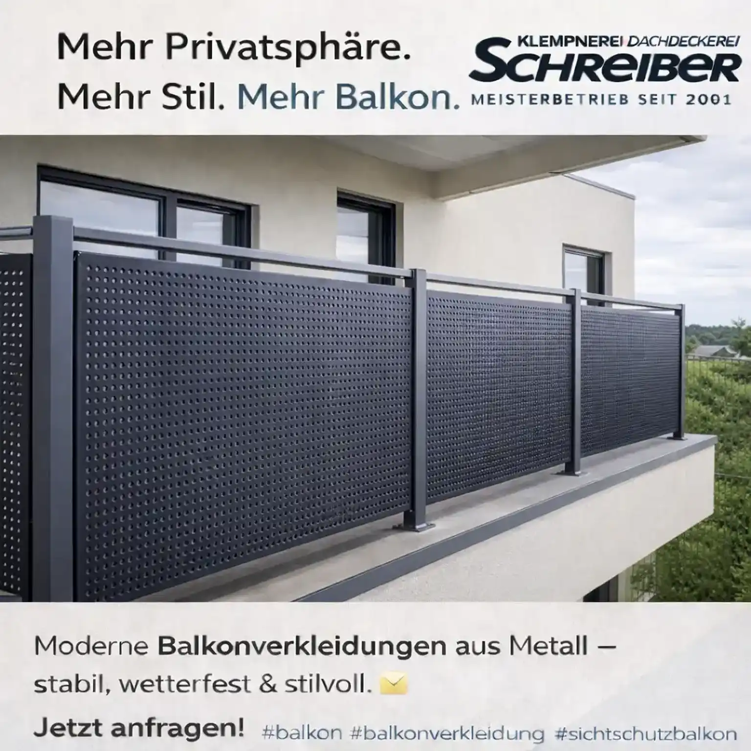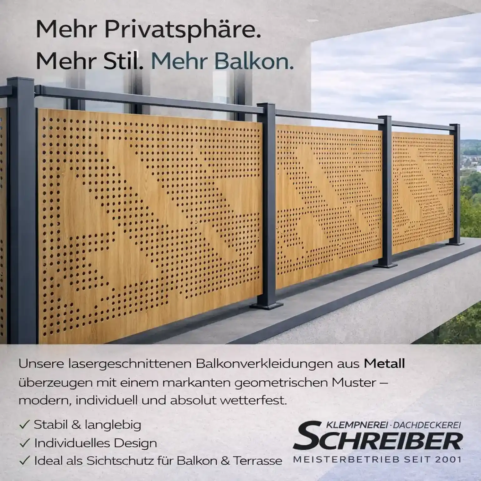 Schreiber fertigt maßgefertigte Sichtschutzelemente für Balkone und Terrassen, aus robustem Metall, präzise verarbeitet und passend zur Architektur. Ideal für Mietwohnungen, Reihenhäuser, Neubauten oder sanierte Bestandsobjekte.