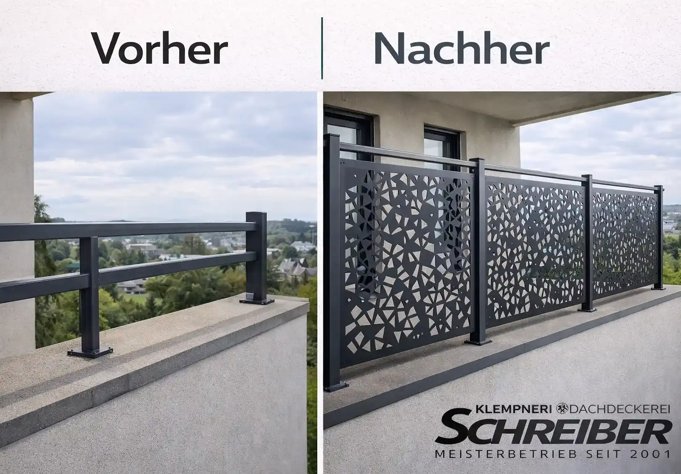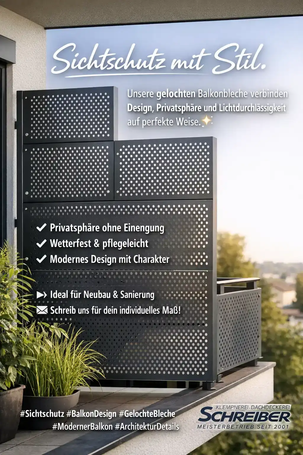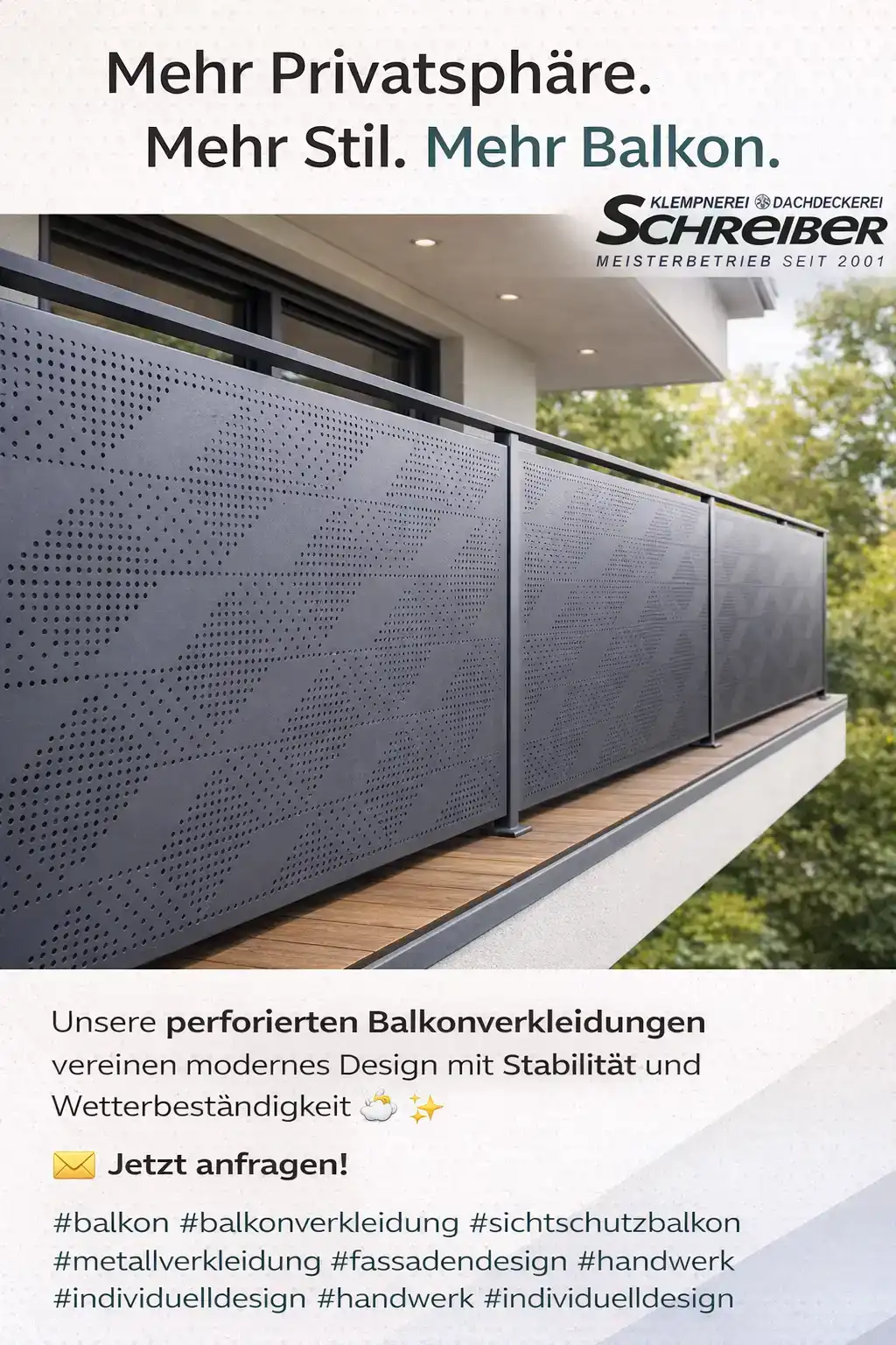 Schreiber fertigt maßgefertigte Sichtschutzelemente für Balkone und Terrassen, aus robustem Metall, präzise verarbeitet und passend zur Architektur. Ideal für Mietwohnungen, Reihenhäuser, Neubauten oder sanierte Bestandsobjekte.